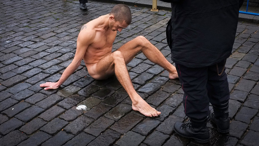 Lors du Jour de la police, le 10 novembre 2013, un autre artiste connu pour ses coups d’éclat, Piotr Pavlenski, complètement nu, a cloué son propre scrotum avec un clou sur les pavés de la place Rouge. Il était déjà connu pour ses opérations autodestructrices (il s’était enveloppé de fil de fer barbelé et s’était cousu la bouche), mais cette fois, il est allé vraiment très loin.