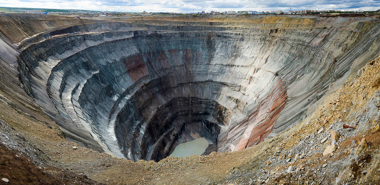 Ancienne mine de diamants, elle a un cratère tellement énorme, que des hélicoptères évitent de la survoler car ils risqueraient d’y être aspirés en raison des courants aériens qu’elle crée. De 525 mètres de profondeur et de 1 200 mètres de diamètre, c’est le deuxième plus grand trou creusé par l’homme au monde.