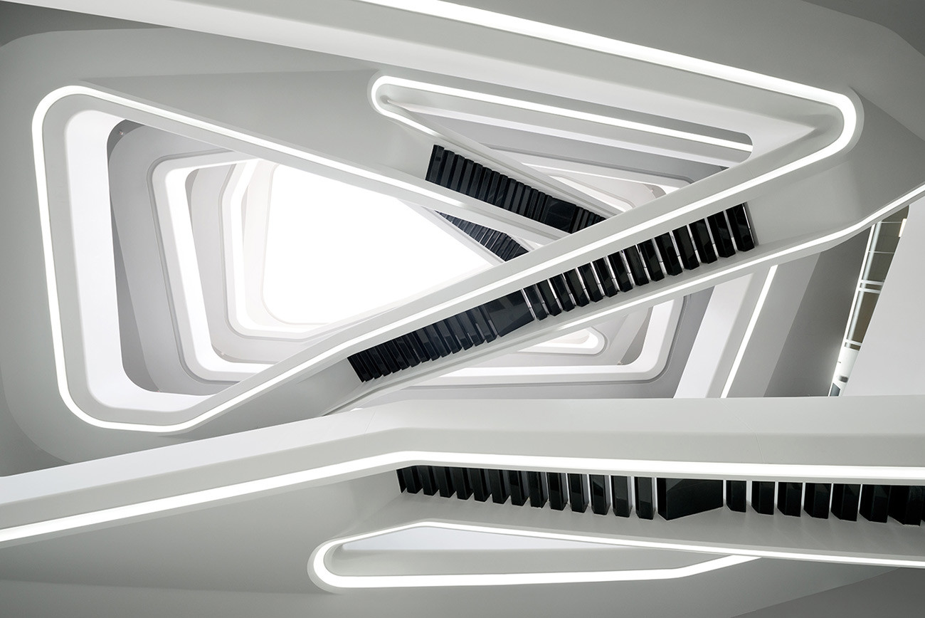 Tout premier projet de Zaha Hadid en Russie, cet immeuble futuriste de couleur blanche surgit au milieu d’une zone industrielle. C’est en réalité un centre d’affaire, dont l’intérieur semble tout droit issu d’un film de science-fiction.