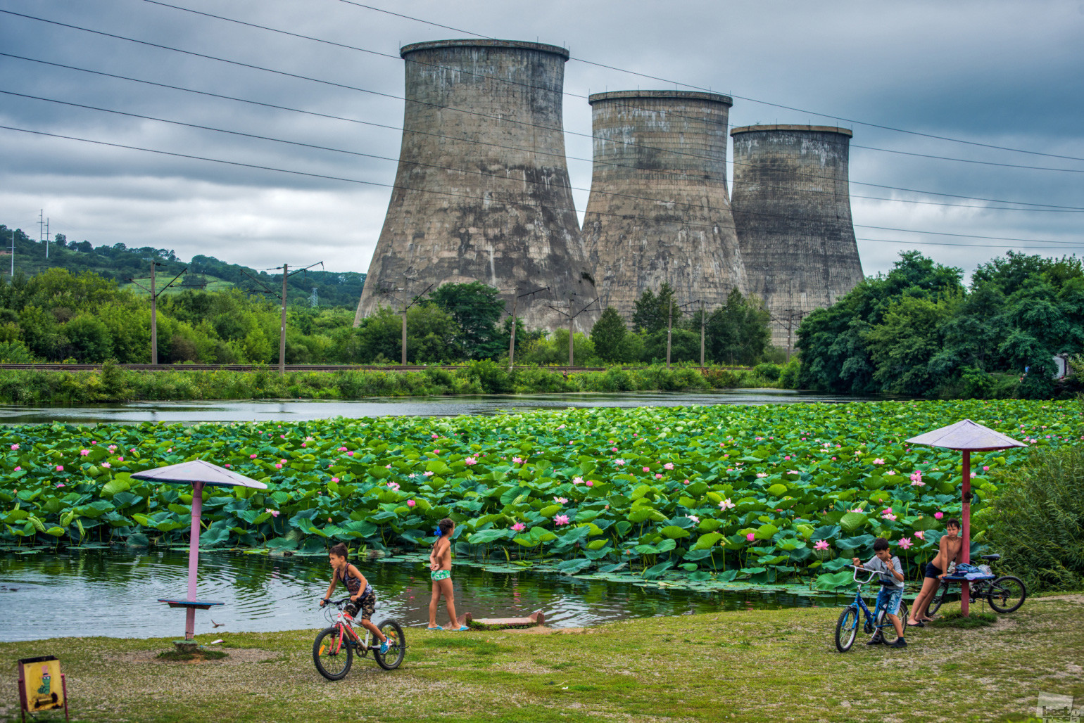 Chaque année, la surface du lac se recouvre de fleurs roses de lotus, ce qui ne fait que renforcer le contraste entre ce plan d’eau naturel et le paysage industriel froid se dressant juste derrière.