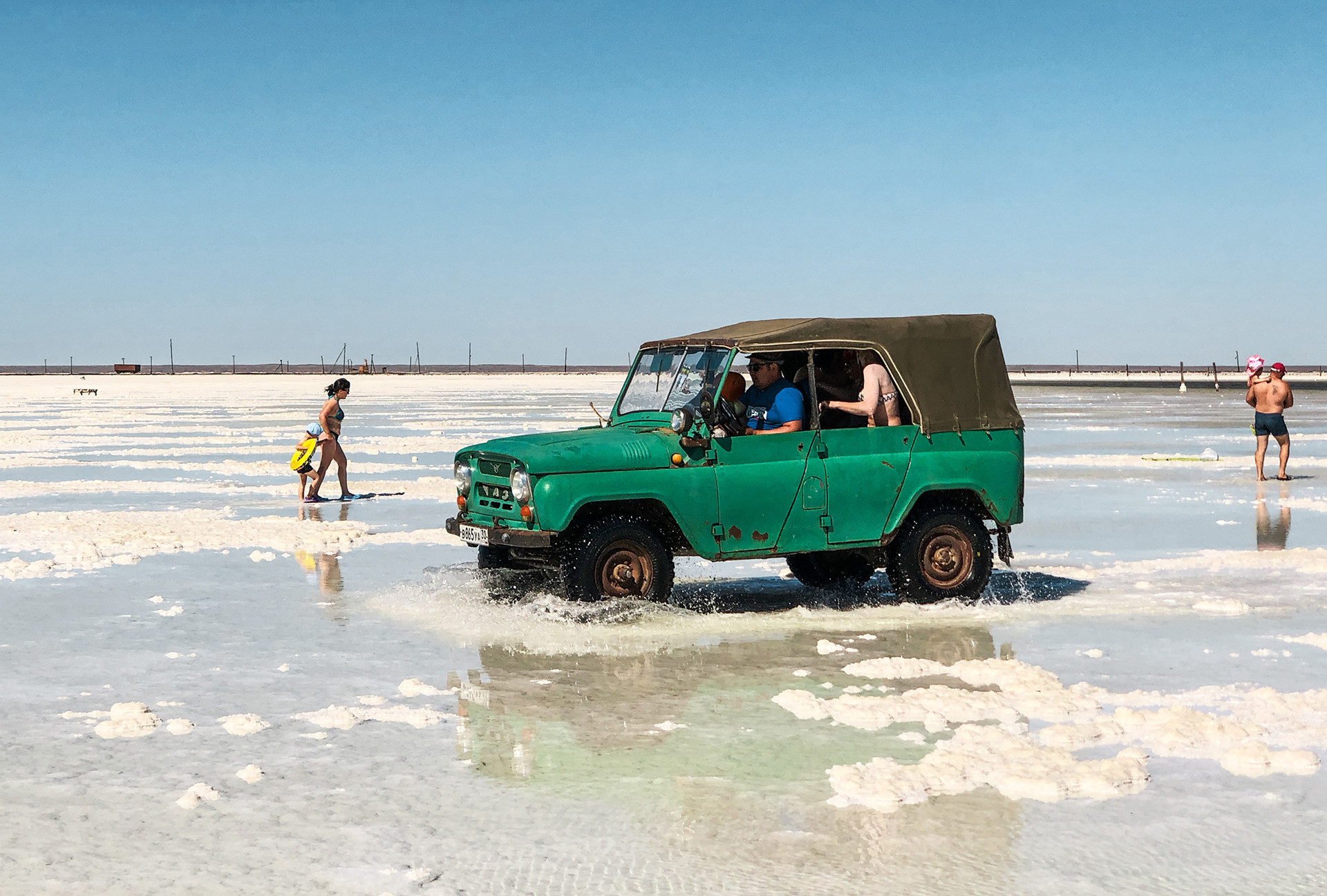 Paysage cosmique au sommet d’une montagne de sel, le lac Baskountchak est en effet une saline naturelle s’étendant sur près de 500 km2 à la frontière avec le Kazakhstan.
