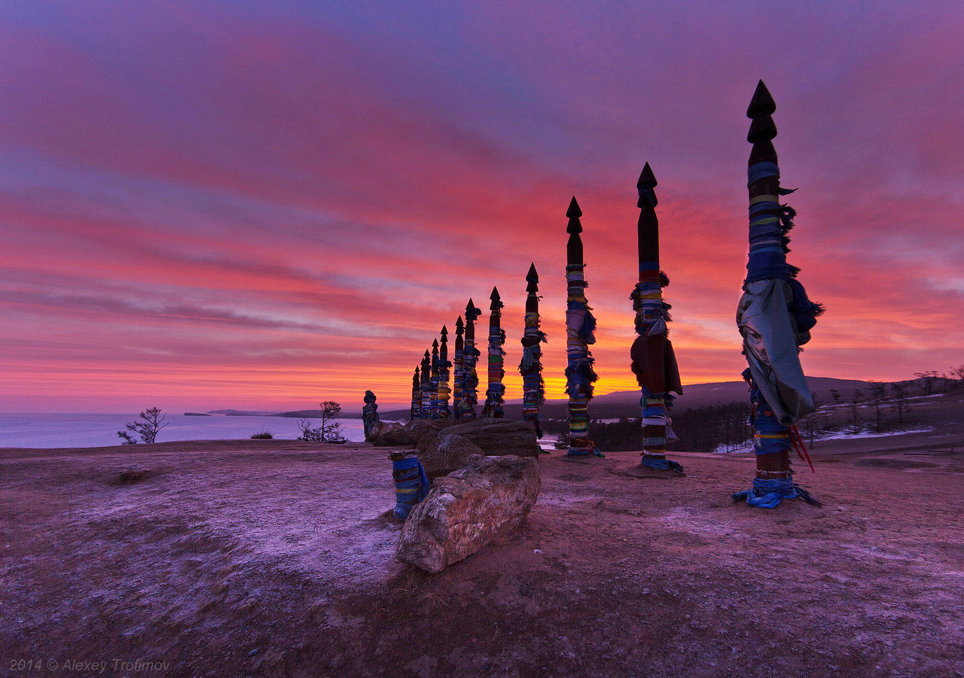 Plantés dans le village de Khoujir, cette « capitale » de la force chamanique située sur l’île d’Olkhon, sur le lac Baïkal, ces poteaux ne peuvent ni être déplacés, ni brûlés. Seul le temps qui passe pourrait avoir raison d’eux.