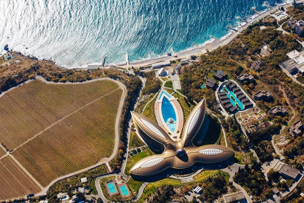Œuvre de Norman Foster, concepteur du Pont du Millenium à Londres et de la tour Cepsa à Madrid, cet hôtel en forme de fleur est situé à 25 kilomètres de la ville de Yalta. En 2016, il a d’ailleurs été reconnu meilleur complexe de villégiature d’Europe.