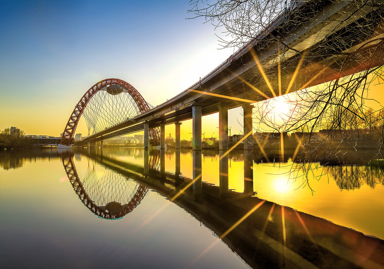 Ce pont de couleur rouge vif passe au-dessus de la zone verte Serebriany Bor, dans le nord-est de la capitale russe. Son arc principal mesure 105 mètres, ce qui en fait le plus haut pont à haubans d’Europe.